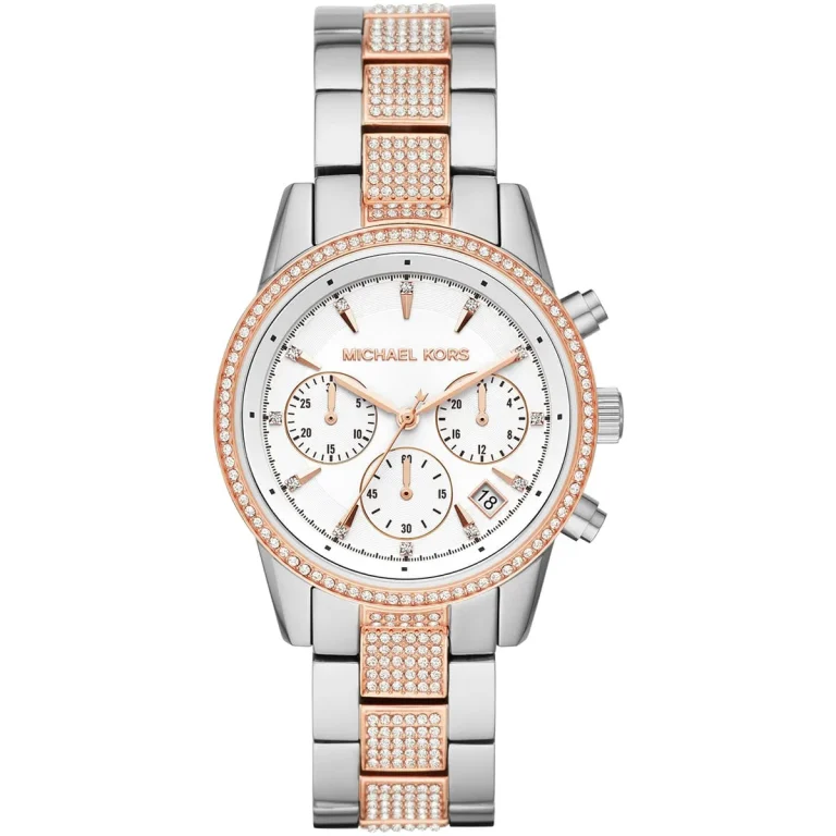EGP3,400.00ساعة مايكل كورس Michael Kors حريمي أصلية موديل ( ريتز ) MK6651 Ritz بلون فضي و استيك معدن بلون فضي و نحاسي