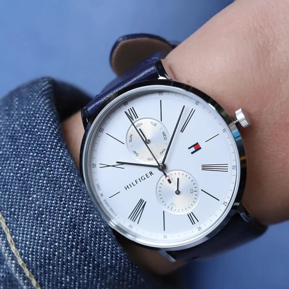 ساعة تومي هيلفيغر Tommy Hilfiger حريمي أصلية موديل (جينا) 1782072 Jenna بلون ابيض و استيك جلد طبيعي بلون ازرق
