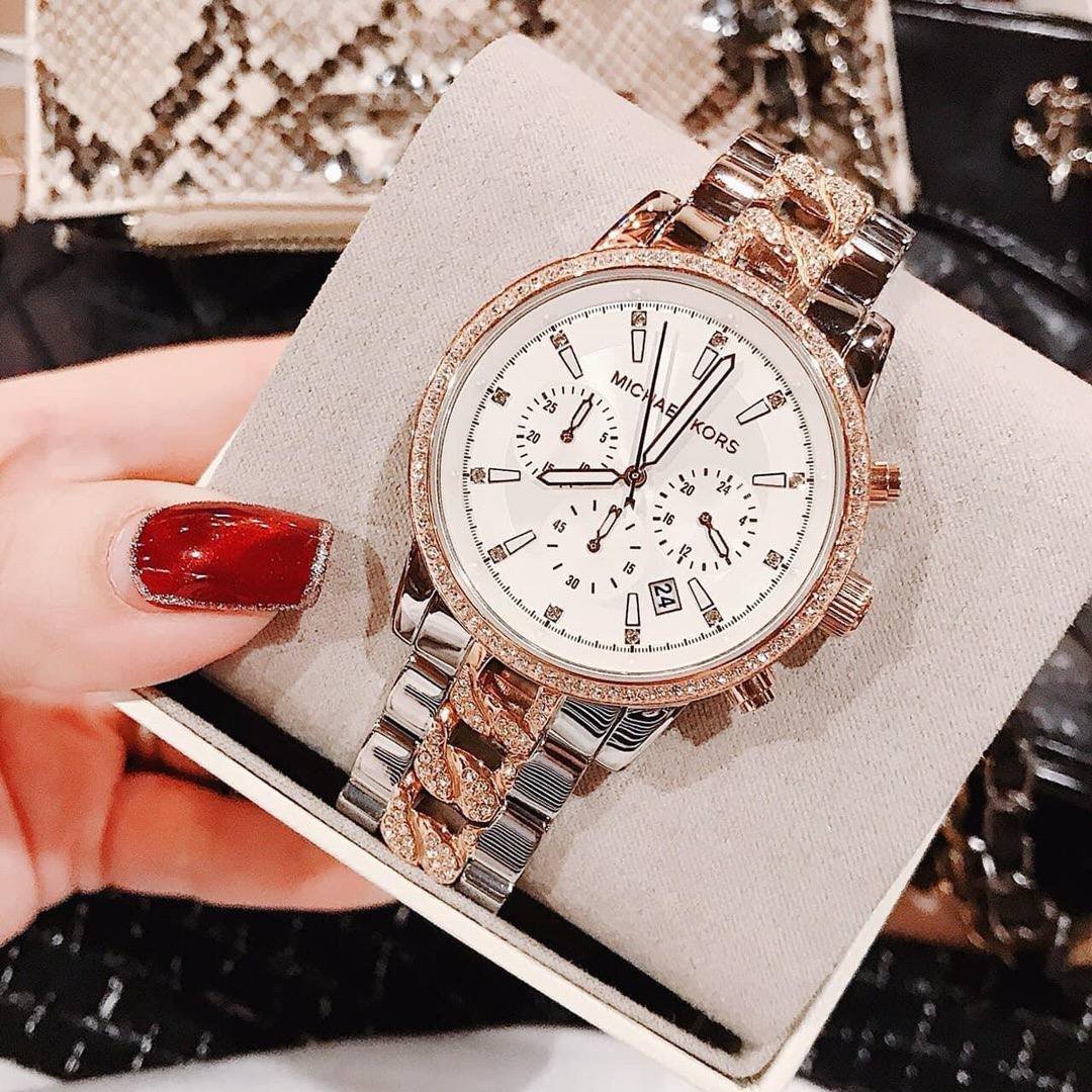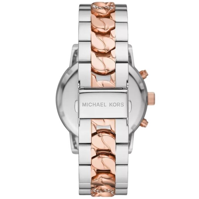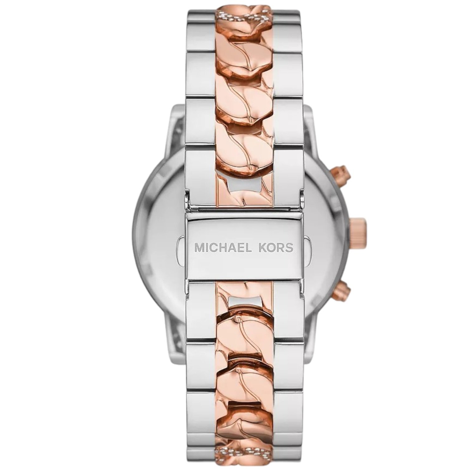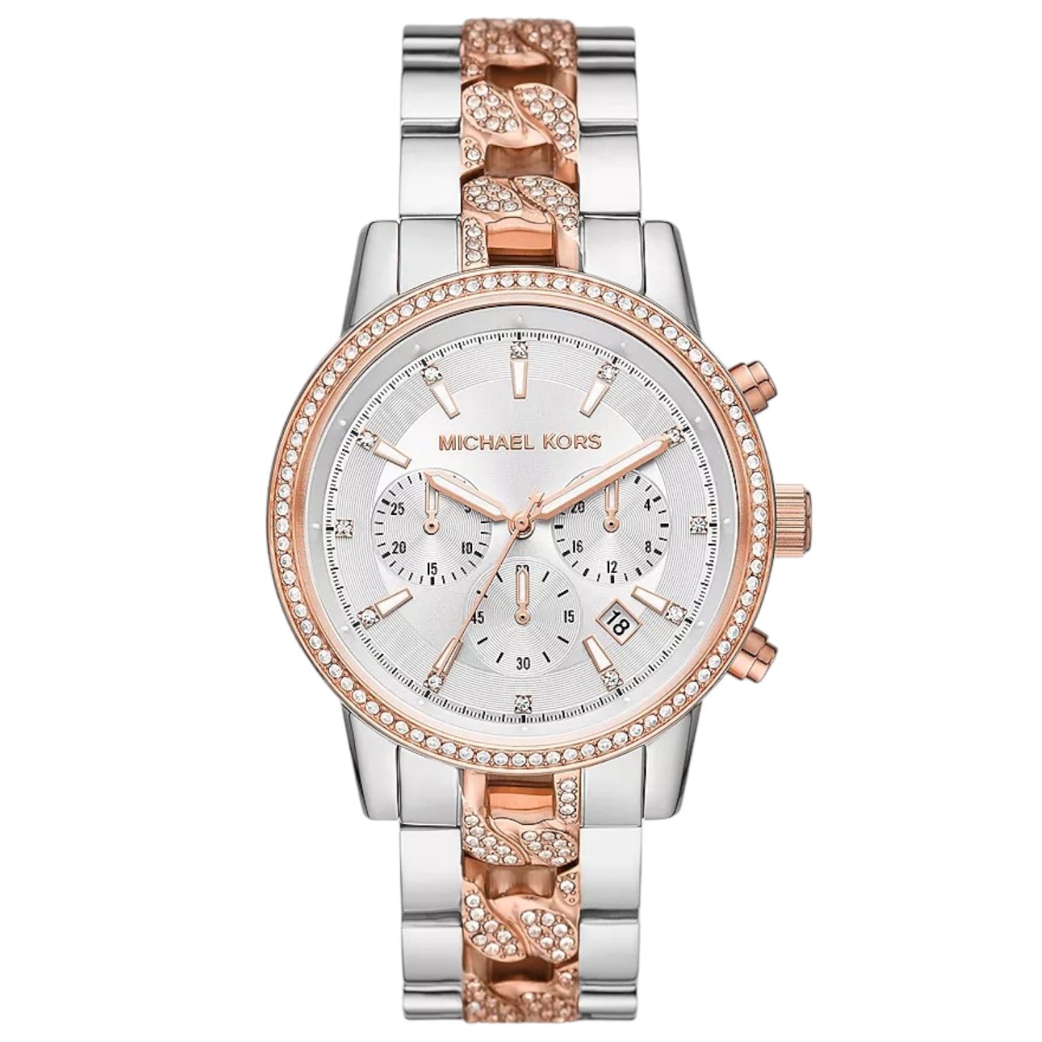 ساعة مايكل كورس للنساء اصلية موديل (ريتز) Ritz MK6938 بلون فضي واستيك معدن بلون نحاسي