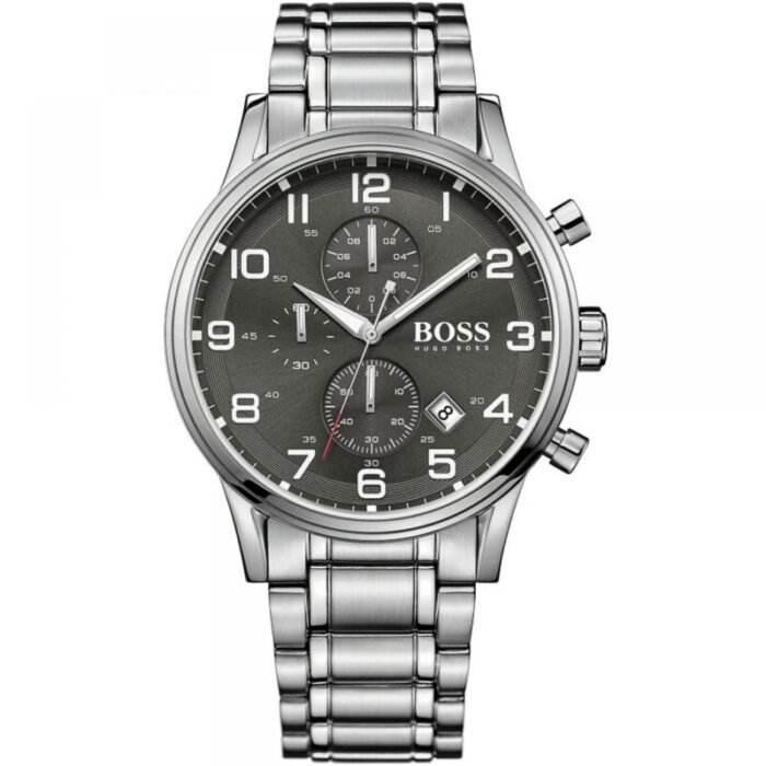 ساعة هوغو بوس للرجال اصلية موديل (ايرولاينر) Aeroliner 1513181 بلون رمادي واستيك معدن لون فضي