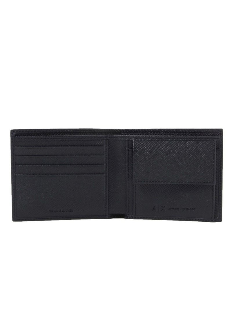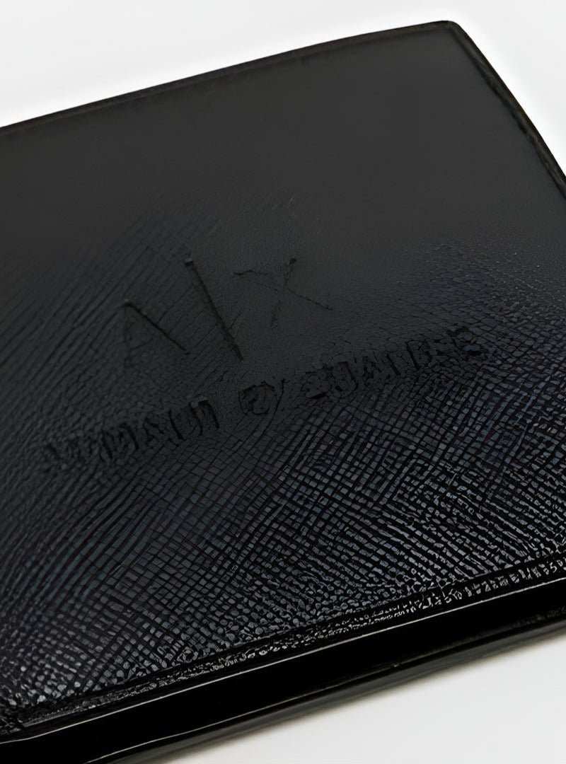 Sleek black Armani Exchange wallet designed for men. Features practical compartments for cards and cash while showcasing the prestigious AX branding. Combines everyday functionality with sophisticated style in a compact design.