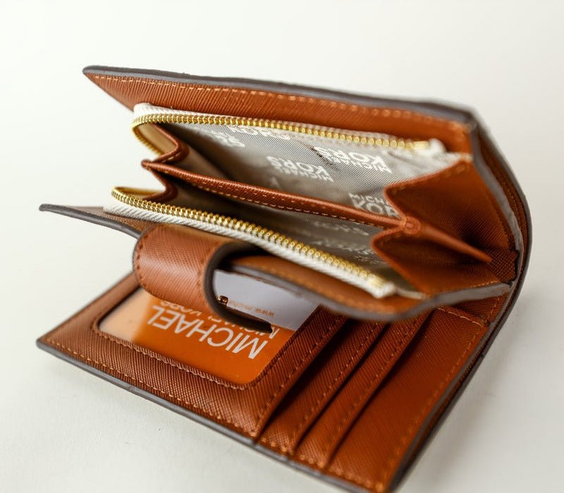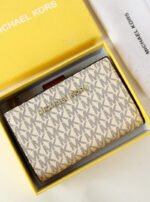 This elegant MK Crafted with meticulous attention to detail, it showcases the brand’s signature style and impeccable quality. The wallet’s exterior boasts the iconic Mk logo pattern in a sophisticated combination of beige and brown. This timeless design is both stylish and versatile, making it suitable for everyday use or special occasions.