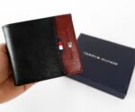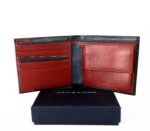 This TH Black Leather Bifold Wallet is crafted from high-quality leather for a sleek and sophisticated look. Its black and burgundy design adds a touch of style, while its bifold design offers practicality and functionality. Perfect for the modern man on the go.